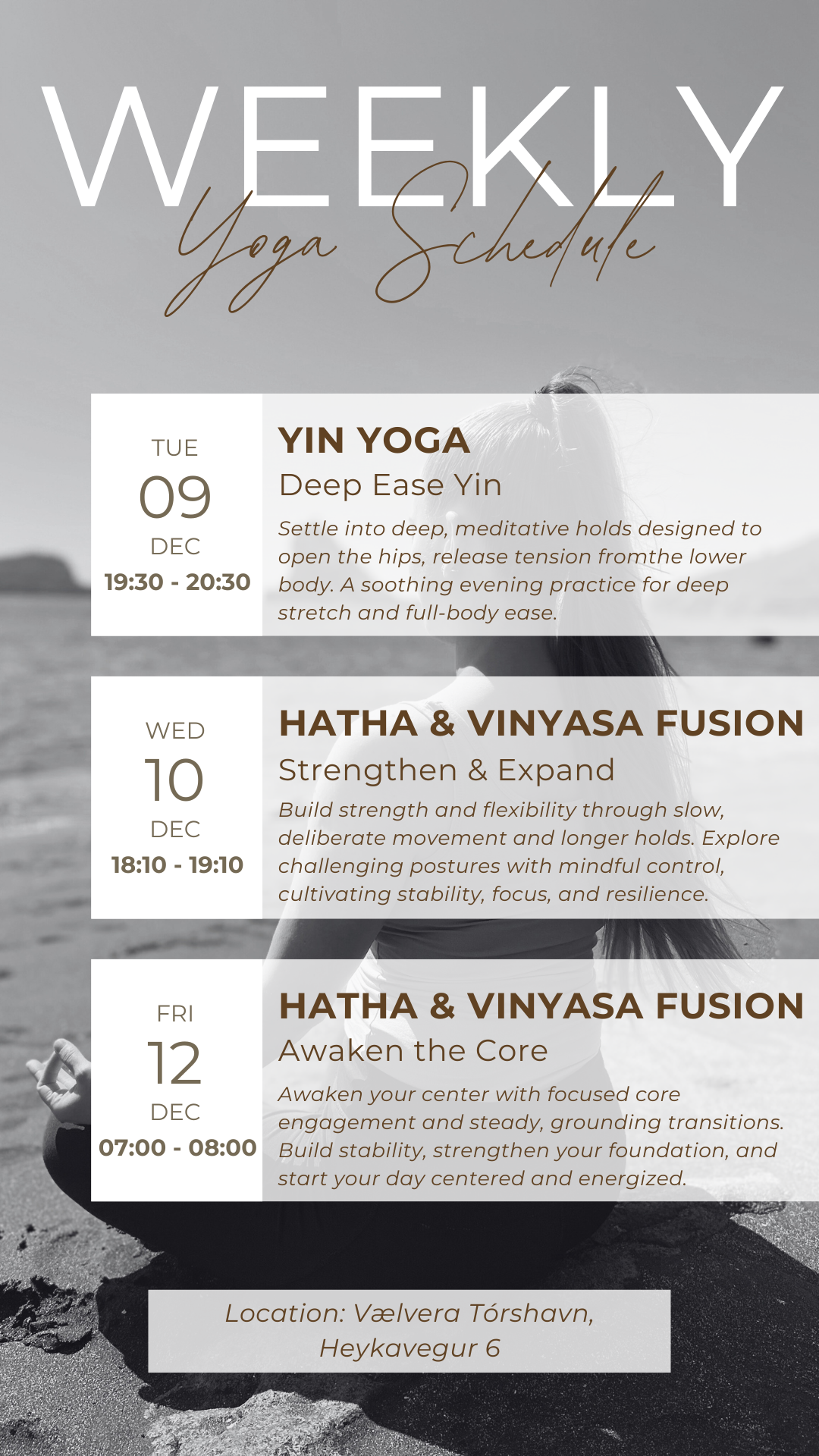Explore the weekly yoga schedule and find a class that fits your needs. All sessions are hosted in-person at Vælvera Fitness in Tórshavn, creating a welcoming space for everyone.